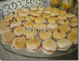 Fiz a encomenda de mini pão árabe e montei o sanduiche com chester e patê de queijo provolone para dar um charme especial decorei os palitinhos com miçangas nas cores que escolhi como tema, inspirada nesta postagem da Bonfa!